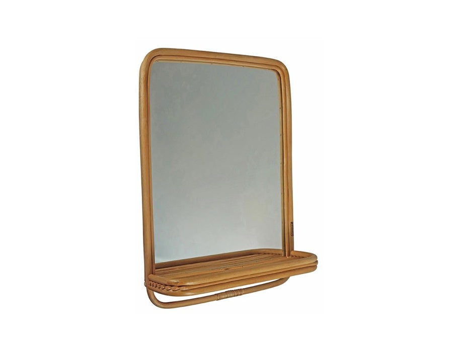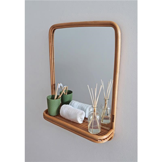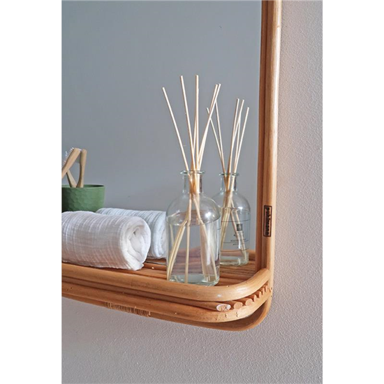 Mooie grote rotan spiegel van bamboe. Met handig plankje voor verzorging producten, sleutels of juist om een leuke plant op te zetten!